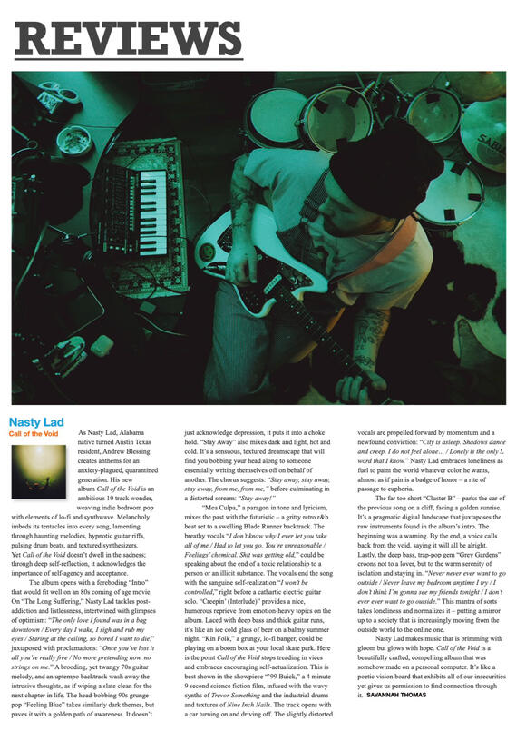 Nasty Lad best describes his music as "misanthropic southern bedroom pop". His fans describe it as "Yeah, what he said." Montgomery, al native Andrew blessing moved to New Orleans before establishing a presence in Austin, TX. working graveyard shifts as a barback, Andrew witnessed the seedy underbelly of the south that challenged his bible-belt upbringing. dark themes and textures mixed with often light airy vocals, nasty lad provides a genre-blending soundtrack to a drunken brawl in a modern day saloon.